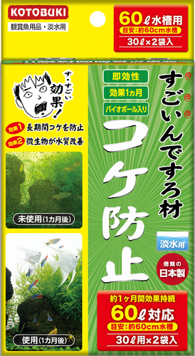 ・長時間コケ防止・微生物が水質改善・使いやすいマット袋タイプ。・適応水容量:60L対応(30L用×2袋入り)・コケ類発生防止剤・アクアリウムの美観を損ねるコケをストップ!●フィルターにセットするだけの簡単設置!即効性が高く、突然発生してしまうコケや藻を約1ヶ月間予防できるので面倒なコケ掃除の手間を軽減します。しかも観賞魚や水草に影響がないので安心して使用いただけます。●高性能セラミック製ろ材 バイオボール入り特殊製法によりバイオボール表層に無数の凹凸を持つ多孔質構造を実現!生きたバクテリアの活着に最適です。