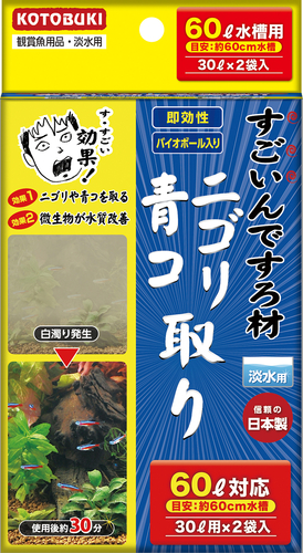 ・ニゴリや青コをとる・微生物が水質改善・使いやすいマット袋タイプ。・60L水槽用(30L用×2袋入り)・ニゴリ除去剤・濁った水を短時間で透明な水に!●フィルターにセットするだけの簡単設置!特殊成分により白ニゴリや青コの粒子を結合・凝固し、フィルターのろ材マットにより除去する事ができます。(ろ材マットは別途ご用意ください)また古くなった水をリフレッシュし理想の水を維持します。●高性能セラミック製ろ材 バイオボール入り特殊製法によりバイオボール表層に無数の凹凸を持つ多孔質構造を実現!生きたバクテリアの活着に最適です。