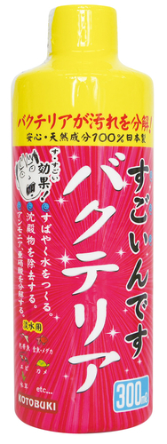 お得用300mlバクテリアが汚れを分解!○有害なアンモニアや亜硝酸を分解、除去し、すばやく水質を安定させます。○水底に沈殿する有機物(残餌、排泄物、枯草など)を分解、除去します。ボトル内に沈殿物が発生される場合がありますが、バクテリアが塊状に形成されたものです。生体に影響はなく、使用上効果が低下する事もございません。ボトルをよく振ってからご使用ください。また、開封後はできるだけ早くご使用いただき、直射日光の当たらない場所に保管してください。水質調整剤/水槽用バクテリア剤