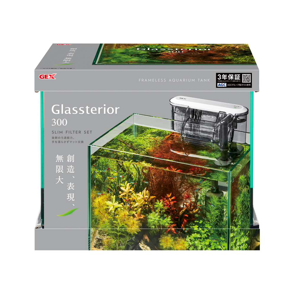 小さなスペースで美しいレイアウトが楽しめる横幅30cmの水槽。濾過器はスリムフィルターSを採用。鏡面加工されたガラス断面は輝きとともに接合の強度をアップさせます。