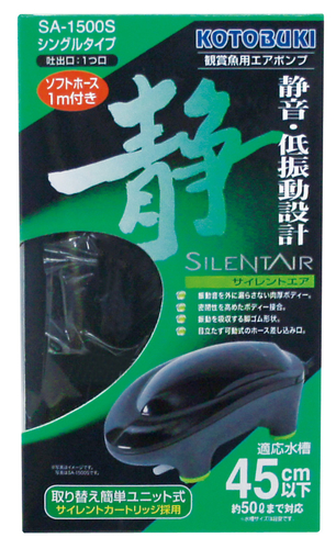 エアポンプ静かさを極めた静音・低振動設計!・振動を低減した静音タイプのサイレントカートリッジを採用。・振動音を外に漏らさない肉厚4ミリの本体ボディ・無駄な空間を排除した流線型のボディデザイン・目立たず可動式のホース差し込み口○吐出量1.5L/min○シングルタイプ○エアホース付