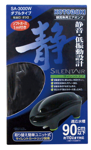 エアポンプ静かさを極めた静音・低振動設計!・振動を低減した静音タイプのサイレントカートリッジを採用。・振動音を外に漏らさない肉厚4ミリの本体ボディ・無駄な空間を排除した流線型のボディデザイン・目立たず可動式のホース差し込み口○吐出量3.0L/min(1.5L×2口)○ダブルタイプ○エアホース付