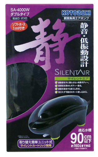 エアポンプ静かさを極めた静音・低振動設計!・振動を低減した静音タイプのサイレントカートリッジを採用。・振動音を外に漏らさない肉厚4ミリの本体ボディ・無駄な空間を排除した流線型のボディデザイン・目立たず可動式のホース差し込み口○吐出量4.0L/min(2.0L×2口)○ダブルタイプ○エアホース付
