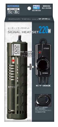 ・シグナルヒーター +サーモスタットET300Xセット・大型ダイヤルで簡単操作。幅広い制御温度はLOW15℃からHI35℃の水温設定が可能。・保温のON/OFFがひと目でわかるシグナルランプと難燃性カバー付・モスグリーンのカラーは水槽レイアウトに溶け込み目立ちません。・サーマルスイッチと温度ヒューズの二重の安全回路で空焚き事故防止。・横向き・縦向きどちらの設置方法でも安定した保温性能を発揮。【適応水槽の目安】60~75㎝水槽 110L以下【製品サイズ】ヒーター :長さ17.5×奥行き4.6×高さ4㎝(コード長:100㎝)ICパワーサーモETー300X:幅5.2×奥行き3.5×高さ11㎝(電源コード:95㎝)観賞魚用ヒーター/水槽用ヒーター