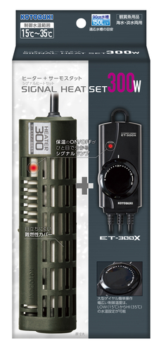 ・シグナルヒーター +サーモスタットET300Xセット・大型ダイヤルで簡単操作。幅広い制御温度はLOW15℃からHI35℃の水温設定が可能。・保温のON/OFFがひと目でわかるシグナルランプと難燃性カバー付・モスグリーンのカラーは水槽レイアウトに溶け込み目立ちません。・サーマルスイッチと温度ヒューズの二重の安全回路で空焚き事故防止。・横向き・縦向きどちらの設置方法でも安定した保温性能を発揮。【適応水槽の目安】90㎝水槽 150L以下【製品サイズ】ヒーター :長さ17.5×奥行き4.6×高さ4㎝(コード長:180㎝)ICパワーサーモETー300X:幅5.2×奥行き3.5×高さ11㎝(電源コード:95㎝)観賞魚用ヒーター/水槽用ヒーター