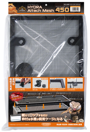 爬虫類・両生類・小動物の飼育に最適!載せてロックするだけ!枠付き水槽が飼育ケージになる!エキゾチックアニマル用ケージネット。適合水槽枠:450×295(300)㎜市販の枠付き水槽に対応KOTOBUKI KC-450Mにジャストフィット!◆便利な機能が充実・ロック機能アタッチメッシシュを水槽にしっかりロック。とても簡単に開閉が可能。・特許出願済み組み合わせにより主要メーカーの枠付き水槽にも適合・メッシュ製約4㎜の網目がケージ内の通気性を確保。また、照明器具などの光を妨げません。・電源コードカバー4本のコード穴を設定。安心のネジ固定式で生体の脱走を防止。◆オプションのライトステーをアタッチメッシュにネジ止めするだけでクリップタイプの保温器具や照明器具を設置可能。