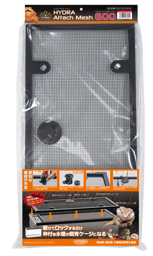 爬虫類・両生類・小動物の飼育に最適!載せてロックするだけ!枠付き水槽が飼育ケージになる!エキゾチックアニマル用ケージネット。適合水槽枠:600×295(300)㎜市販の枠付き水槽に対応KOTOBUKI KC-600Sにジャストフィット!◆便利な機能が充実・ロック機能アタッチメッシシュを水槽にしっかりロック。とても簡単に開閉が可能。・特許出願済み組み合わせにより主要メーカーの枠付き水槽にも適合・メッシュ製約4㎜の網目がケージ内の通気性を確保。また、照明器具などの光を妨げません。・電源コードカバー4本のコード穴を設定。安心のネジ固定式で生体の脱走を防止。◆オプションのライトステーをアタッチメッシュにネジ止めするだけでクリップタイプの保温器具や照明器具を設置可能。