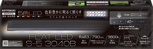 5色LEDで色彩豊かに明るく照らす!スリムで高スペックなLED(ホワイト/オレンジ/レッド/ブルー/グリーン)◆定格消費電力:11W◆明るさ790ルーメン◆適合水槽:30~40㎝◆奥行き40㎜のスリム設計◆熱によるLEDの劣化を最小限に抑制するアルミ素材◆スライド式リフトアップパーツ付き◆枠付き、フレームレス水槽どちらにも対応アクアリウムライト/LEDライト