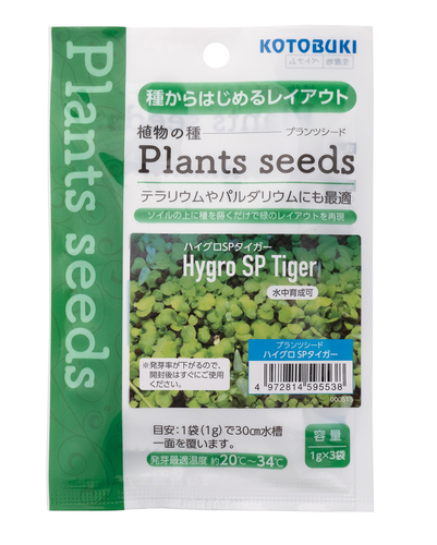 「種からはじめるレイアウト」植物の種テラリウムやパルダリウムにも最適!・湿ったソイルの上に種を蒔くだけで気温が約20℃〜34℃の環境であれば7〜14日程で簡単に発芽します。※発芽後に水を張り、照明を当てて水中で水草として育てることも可能です。(最初の双葉の後、本葉が生えてから水を張ってください。)目安:1袋(1g)で30㎝水槽一面を覆います。・必ず発芽最適温度の約20℃~34℃になるように心がけてください。・使用する底砂は、必ずソイルを使用するようにしてください。・セットする前の種に光を長時間当てないでください。・ソイルに中に種を埋めないでください。・発芽するまでは常にソイルと種が水で湿っているようにしてください。・必要以上の水の与えすぎに注意してください。カビ発生の原因になります。水草の種・レイアウト水槽・水草水槽