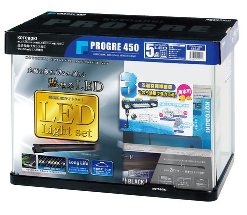 ■美しさと安全性、使いやすさの曲げガラス水槽「プログレシリーズ」■高輝度LEDライトと水中ポンプ式の上部フィルターのセットです。水槽セット*水槽:プログレ450 フレーム付45cm前面曲げガラス水槽*LEDライト:フラットLED SS 4052 ブラック・全光束(ルーメン):590lm・定格消費電力:10W*上部式フィルター:スーパーターボ トリプルボックス 450・ポンプ形式:水中ポンプ・定格消費電力(50/60Hz):6.0W/7.0W※セット内容は予告なく変更する場合があります。45㎝水槽枠付き水槽