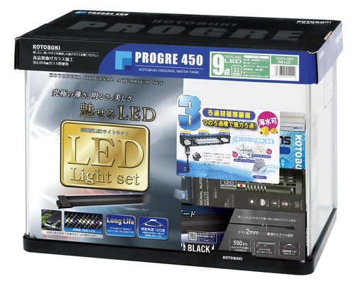 ■美しさと安全性、使いやすさの曲げガラス水槽「プログレシリーズ」■保温器具と高輝度LEDライトと水中ポンプ式の上部フィルターのセットです。水槽セット*水槽:プログレ450 フレーム付45cm前面曲げガラス水槽*LEDライト:フラットLED SS 4052 ブラック・全光束(ルーメン):590lm・定格消費電力:10W*上部式フィルター:スーパーターボ トリプルボックス 450・ポンプ形式:水中ポンプ・定格消費電力(50/60Hz):6.0W/7.0W*保温器具:※セット内容は予告なく変更する場合があります。