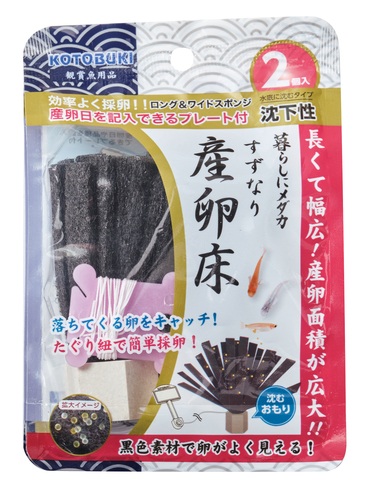 メダカの産卵床。水底に沈むタイプ、落ちてくる卵をキャッチ!●卵を産みつけやすい固さと形状の繊維を採用。●本体をそのまま水槽に沈めるだけの簡単設置。産卵日や品種が記入できるプレート付。沈めた産卵床はたぐり紐で簡単採卵。ロングでワイドなスポンジだから産卵しやすい。黒色素材で卵がよく見える。大きいと感じた時はスポンジ部分をカットして好みのサイズに。材質:おもり:セラミック、スポンジ:ポリエステル、プレート:PVC、紐:ナイロンメダカの産卵シーズンにご使用ください。