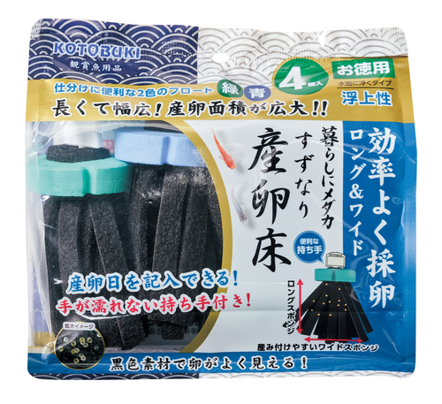 メダカの産卵床。水面に浮くタイプ、仕分けに便利な2色のフロート採用!●卵を産みつけやすい固さと形状の繊維を採用。●本体をそのまま水槽に浮かべるだけの簡単設置。産卵日や品種が記入でき、手が濡れない持ち手付き。ロングでワイドなスポンジだから産卵しやすい。黒色素材で卵がよく見える。大きいと感じた時はスポンジ部分をカットして好みのサイズに。材質:フロート:EVA発泡体、スポンジ:ポリエステル、持ち手:PVCメダカの産卵シーズンにご使用ください。