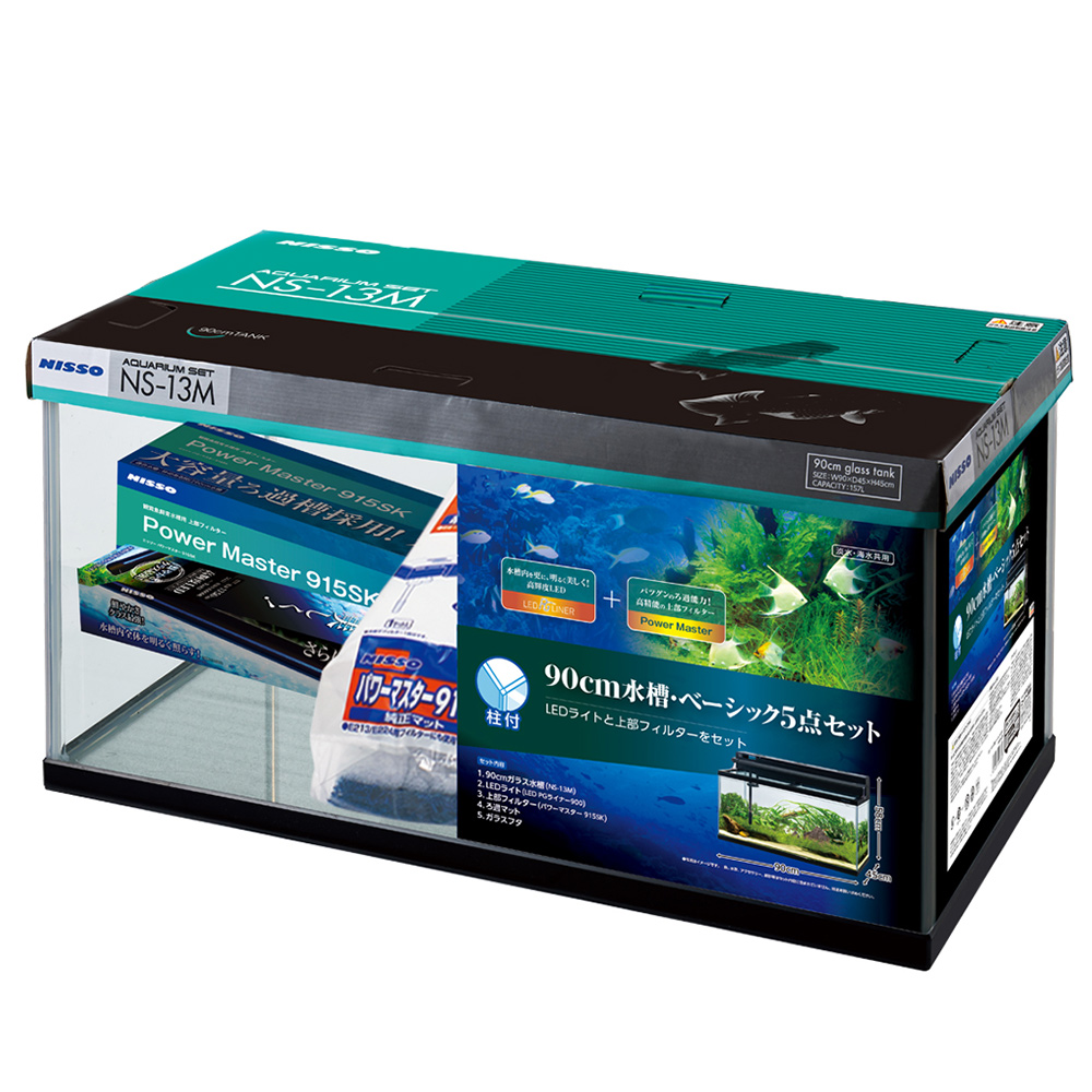 90cm 角水槽に、水槽内を美しく照らす高輝度LEDライトと高性能上部フィルターをセットにしました。