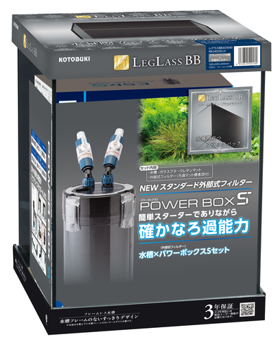 背面がブラックになったレグラスに簡単にスタートできるパワーボックスS453をセット。水槽:レグラックブラックバック外部式フィルター:パワーボックスS453パワーボックスSは、高性能な活性炭スポンジマットとウールマットの吸着、物理ろ過でニゴリ・黄ばみ・臭いなどを取り除き、さらにリングろ材で生物ろ過も行うトリプルろ過システムを実現。すっきり透明な水を作り出します。●水を注ぐだけの呼び水機能で楽々簡単スタートを実現。●フレームレス水槽には、パイプホルダーを採用。吸送水パイプをしっかり固定できます。●360度フル回転!バルブタップ。●セーフティロックで完全密閉。●用途に応じて選べるシャワーパイプと2種類のディフューザーを標準装備。適応水槽45㎝〜60㎝(35ℓ〜60ℓ)ポンプ流量 50Hz:約590ℓ/h 60Hz:約690ℓ/h水槽設置時流量 50Hz:約300ℓ/h 60Hz:約370ℓ/hフィルターボックス 約2.8ℓインナーバスケット容量(1個)/約0.6ℓ