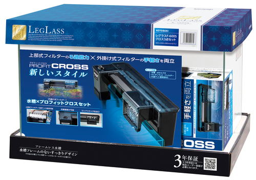 レグラスに新スタイル外掛け式フィルター『プロフィットクロス』がセット!上部式フィルターのろ過能力と外掛け式フィルターの手軽さを両立。※詳細画像はガラスブタを外して撮影しています。水槽:レグラスF-600フィルター:プロフィットクロス解放的な水槽上部を実現市販の上部式フィルターろ過マットが使用可能本体幅:約435㎜定格消費電力7W/8W流量(1分間あたり):約8/9ℓ・標準セット:パワー活性炭マット、PF-001ストレーナースポンジ・適応水槽:45〜60㎝/90㎝スリム水槽・水容量90ℓまで・ろ過槽容量:約3ℓ・枠付き水槽/フレームレス水槽対応・流量調節機能:水槽サイズにあった流量へ自由に調節可能・水槽サイズに合ったストレーナーを使用する事で対応水深4パターンまで対応(水深:最短20㎝から最長36㎝まで)・オプションで当社パワーリングミニを最大2つまで設置可能・従来の外掛け式フィルターより吐出口を長くすることで水面に静かに入水し、ジャリの拡散を軽減する、やさしい水流を実現(水流可変パーツで水流に変化をつける事も可能)