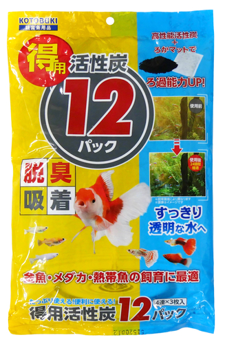 たっぷり使える!便利に使える!活性炭マット12パックお得用!高性能活性炭+ろかマットでろ過能力UP!金魚・メダカ・熱帯魚の飼育い最適!・外掛け式フィルターのすき間に・上部式フィルターのろ過槽にピッタリ!・鉢に最適・小型水槽に最適・小分けにしても使用可能材質:活性炭、不織布(ポリエステル)内容量:活性炭約360g(1パックあたり約30g)●飼育水15〜20ℓあたり1パックを目安にご使用ください。