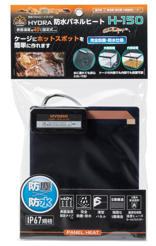 ケージにホットスポットを作るケージの外側でも内側でも設置可能です。※安全を守るため、噛みつくことが予想される生体はケージの外から温めてください。◎爬虫類・両生類・小動物用ヒーターIP67規格 防塵・防水仕様■表面温度固定タイプ:約40℃※当社製品「ヒートコントロールHC-200」(電圧調整機器)を使用する事で温度の出力を抑制する事も可能です。薄型パネル強固な5層構造3重の安全設計:難燃性樹脂/温度ヒューズ/サーマルプロテクター■消費電力:6W■発熱部有効寸法:155×160㎜濡れても安心!完全防水!丸洗いOK!!