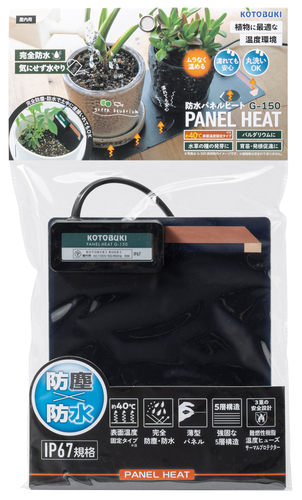 冬の時期や夜間の気温低下から植物を守り、根の周辺の冷え込みを防ぐことで、成長の停滞を回避します。また、植物の発根管理における最適な温度を保ち、根の働きをサポートします。◎植物・育苗用ヒーターIP67規格 防塵・防水仕様■表面温度可変式タイプ:約30〜55℃コンパクトな中間スイッチ(マイクロダイヤル)で簡単コントロール。※使用環境により高温になりすぎる場合や、より細かい温度設定を必要とする場合には別途サーモスタット(ヒュドラヒートHT-330XD)を併用することも可能です。(ヒートコントロールの様な電圧調整機器は接続することは出来ません。)薄型パネル強固な5層構造3重の安全設計:耐熱樹脂/温度ヒューズ/電子回路制御■消費電力:12W■発熱部有効寸法:155×160㎜■ヒーター部:W195×D160×H15(制御部)㎜ コード長180㎝中間スイッチ:W60×D36×H22(制御部)㎜◯水草の種の発芽に◯育苗・発根促進に◯パルダリウムに濡れても安心!完全防水!丸洗いOK!!