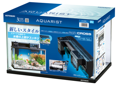 スタンダードな枠付き水槽に新スタイルの外掛け式フィルター『プロフィットクロス』がセット!市販の上部式フィルターマットが使用可能。水槽:枠付き水槽450Mフィルター:プロフィットクロス解放的な水槽上部を実現市販の上部式フィルターろ過マットが使用可能本体幅:約435㎜定格消費電力7W/8W流量(1分間あたり):約8/9ℓ・標準セット:パワー活性炭マット、PF-001ストレーナースポンジ・適応水槽:45〜60㎝/90㎝スリム水槽・水容量90ℓまで・ろ過槽容量:約3ℓ・枠付き水槽/フレームレス水槽対応・流量調節機能:水槽サイズにあった流量へ自由に調節可能・水槽サイズに合ったストレーナーを使用する事で対応水深4パターンまで対応(水深:最短20㎝から最長36㎝まで)・オプションで当社パワーリングミニを最大2つまで設置可能・従来の外掛け式フィルターより吐出口を長くすることで水面に静かに入水し、ジャリの拡散を軽減する、やさしい水流を実現(水流可変パーツで水流に変化をつける事も可能)