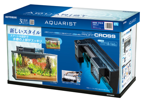 スタンダードな枠付き水槽に新スタイルの外掛け式フィルター『プロフィットクロス』がセット!市販の上部式フィルターマットが使用可能。※詳細画像はガラスブタを外して撮影しています。水槽:枠付き水槽600Sフィルター:プロフィットクロス解放的な水槽上部を実現市販の上部式フィルターろ過マットが使用可能本体幅:約435㎜定格消費電力7W/8W流量(1分間あたり):約8/9ℓ・標準セット:パワー活性炭マット、PF-001ストレーナースポンジ・適応水槽:45〜60㎝/90㎝スリム水槽・水容量90ℓまで・ろ過槽容量:約3ℓ・枠付き水槽/フレームレス水槽対応・流量調節機能:水槽サイズにあった流量へ自由に調節可能・水槽サイズに合ったストレーナーを使用する事で対応水深4パターンまで対応(水深:最短20㎝から最長36㎝まで)・オプションで当社パワーリングミニを最大2つまで設置可能・従来の外掛け式フィルターより吐出口を長くすることで水面に静かに入水し、ジャリの拡散を軽減する、やさしい水流を実現(水流可変パーツで水流に変化をつける事も可能)