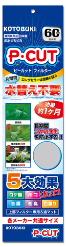 ピーカットシリーズ●60㎝上部フィルター用効きめは短時間で表れ、効果は長期間持続します。(約1ヶ月)・淡水用古くから亜鉛、銀などには防藻性、抗菌性があると言われています。ピーカット中の酸化亜鉛ウィスカ及び銀化合物が水中で極微量徐々に溶け出し、緑藻類の成長を抑制します。また、ピーカット中の青コ除去成分は青コを互いに結合させ、粒子を大きくろ過材で除去しやすくします。(通常、青コは粒子が細かいため通常のろ過材では除去できません)※青コを殺すのではなく、生きたままマットに蓄積しますので安全です。