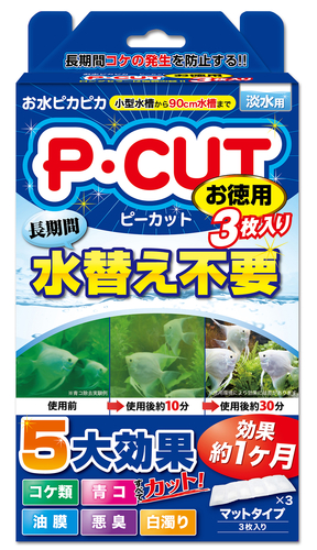 ピーカットシリーズマットタイプ3枚入り効きめは短時間で表れ、効果は長期間持続します。・淡水用古くから亜鉛、銀などには防藻性、抗菌性があると言われています。ピーカット中の酸化亜鉛ウィスカ及び銀化合物が水中で極微量徐々に溶け出し、緑藻類の成長を抑制します。また、ピーカット中の青コ除去成分は青コを互いに結合させ、粒子を大きくろ過材で除去しやすくします。(通常、青コは粒子が細かいため通常のろ過材では除去できません)※青コを殺すのではなく、生きたままマットに蓄積しますので安全です。効果は水質・環境により異なりますが、下記の通りです。・青コ・白濁り・油膜・悪臭の除去効果:30〜60分程度(但し効果は1回限り)・緑藻類の発生抑制効果:マットタイプ1枚/約1ヶ月使用目安小型水槽:2/1枚60㎝水槽:1枚75㎝水槽:2枚90㎝水槽:3枚主成分:アルミナ/酸化亜鉛/銀化合物/リン酸カルシウム